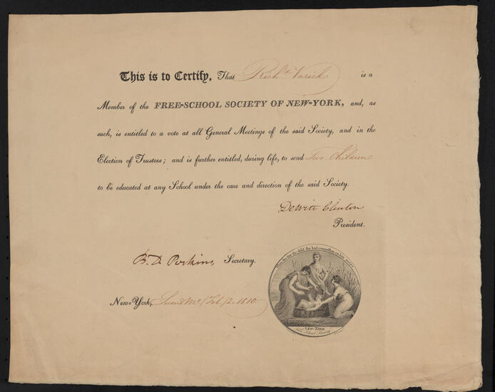 [Certificate of membership to the New York Marine Society issued to Richard Varick on March 22.]