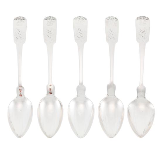 One of a set of five teaspoons with rounded shoulders, egg-shape bowl, single bowl-back drop, and downturned fiddle handle die-struck with sheaf of wheat motif at handle end. Inscription: Engraved on handle obverse: "GSP" in feathered script. Mark: On handle reverse: "P.MARTIN" in rectangle.