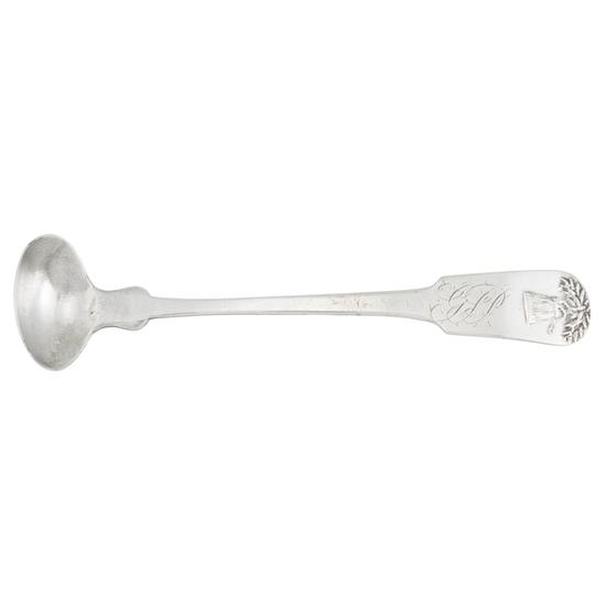 Mustard spoon with oval bowl, downturned fiddle handle with rounded shoulders, and die-struck with sheaf of wheat motif at handle end. Inscription: On handle obverse in feathered script: "GSP". Mark: On handle reverse: "P.MARTIN" in rectangle.