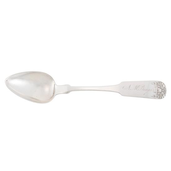 Teaspoon with egg-shape bowl, downturned fiddle handle, and die-struck with basket of flowers motif. Inscription: Engraved on handle obverse: "N.M. Bangs" in script. Mark: On handle reverse: "Wm SMITH" in serated rectangle.