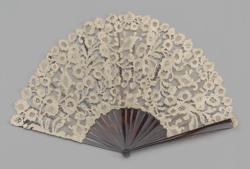 Folding fan of black Chantilly lace leaf with applied gold spangles