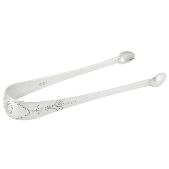 Sugar tongs with oval tips and handle engraved at bowl with oval cartouche and drops. Inscription: Engraved on outer surface of bows: PC. | Mark: Marked on inside of one arm: JHR.