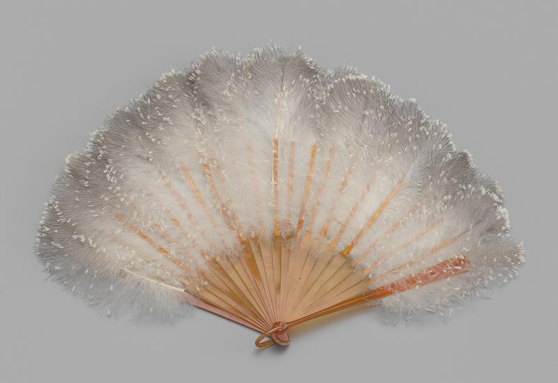Folding feathered fan of clipped ostrich feathers