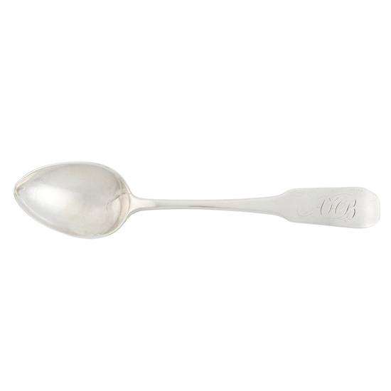 Teaspoon with egg-shaped bowl, downturned finless fiddle handle, and single drop on bowl back. Inscription: Engraved on handle obverse: A. H. B. Engraved on handle reverse: Abraham Bussing / 1794 / Hester Kingsland. | Mark: Marked on handle reverse: Rockwell.