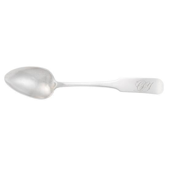 Teaspoon with pointed egg-shaped bowl and downturned fiddle handle. Inscription: Engraved on handle obverse: C D Y Mark: Marked on handle reverse: M P.
