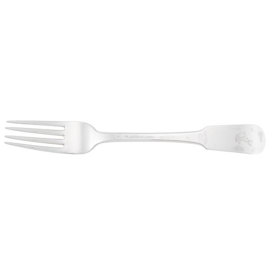 Fork with four tines decorated on downturned finless fiddle handle engraved with Stuyvesant crest. Mark: Marked on handle reverse: F. Marquand.