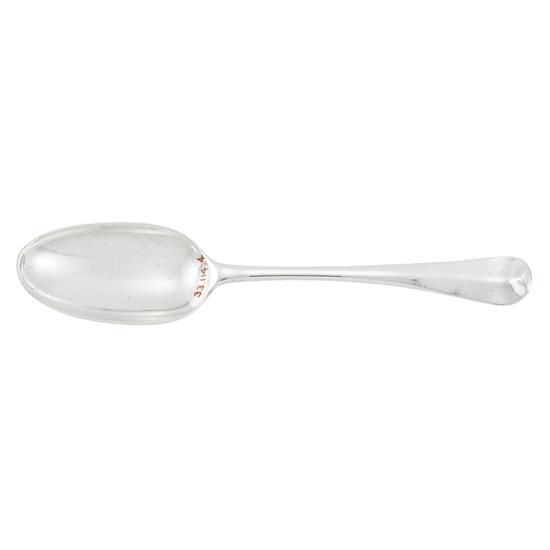 Dessert spoon with rounded, upturned, front-tipped handle with faint front midrib and molded double drop on bowl back. Inscription: Engraved on handle reverse: ED / PE * M. | Mark: Marked on handle reverse, near bowl: SS.