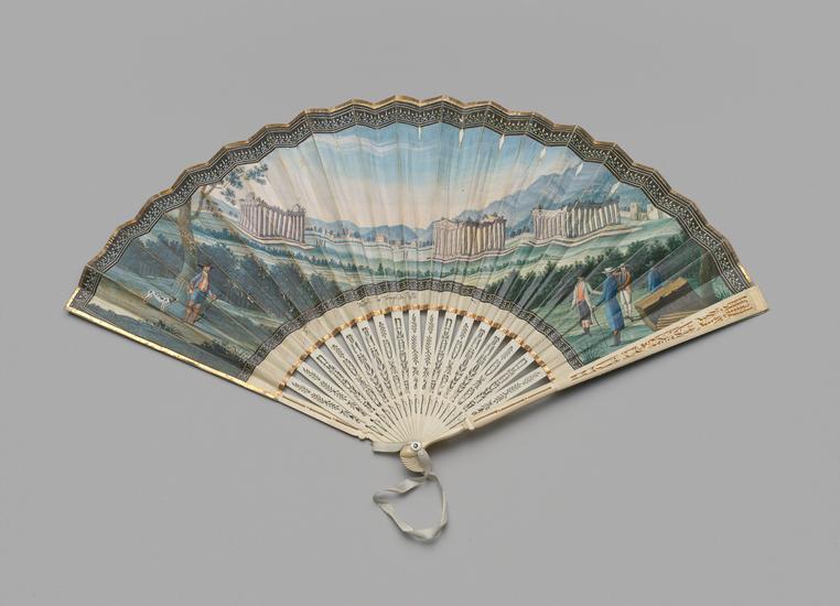 Folding fan of painted skin leaf, depicting ladies in Spanish attire feeding swans