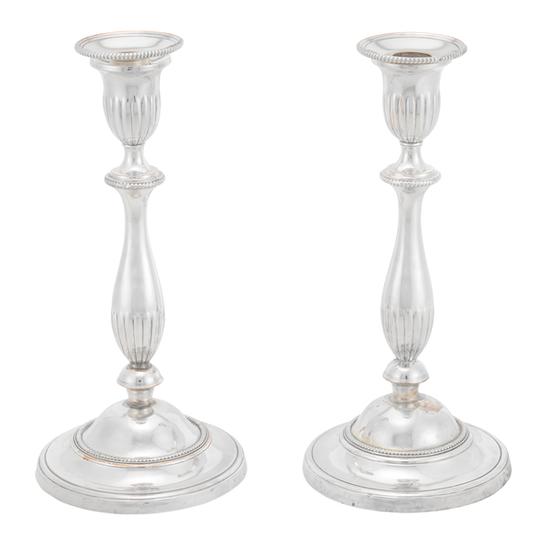 One of a pair of Sheffield (fused) plate candlesticks with plain circular base and bead molding.