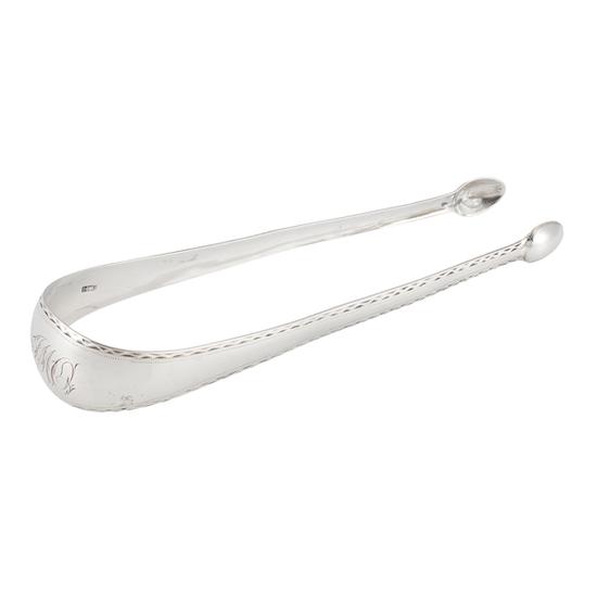 Sugar tongs with oval spoon-shaped ends, and decorated with bright-cut ornament on edges. Maker attributed. Inscription: Engraved on handle: JMO. Mark: Marked on handle reverse: B H.