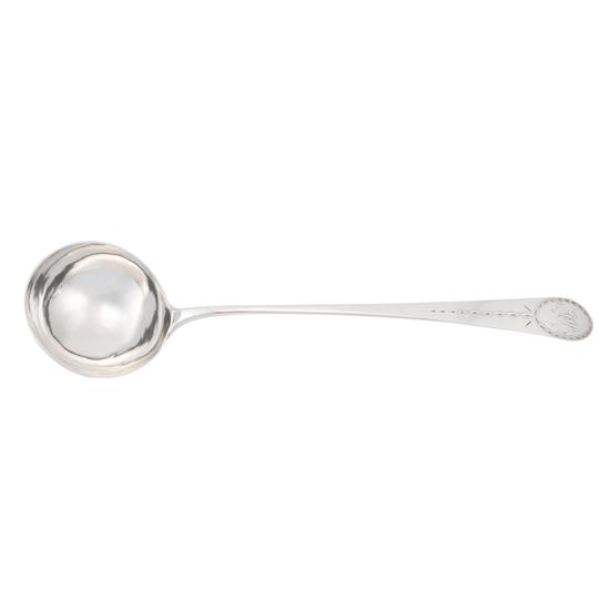 Ladle with long drop with line on back of round bowl, straight handle with slightly downcurved handle tip, and decorated with engraved bright-cut medallion. Inscription: Engraved on front of handle in script: "JMO" in oval reserve; Scratch weight on handle reverse: "5 9". Mark: Struck twice on handle reverse in script: "WG" in rectangle.