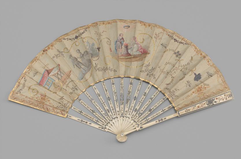 Folding fan of tan silk with painted spray of chrysanthemeums