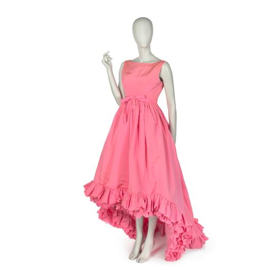 Evening ensemble comprising dress and coat of pink silk and silver metallic floral brocade
