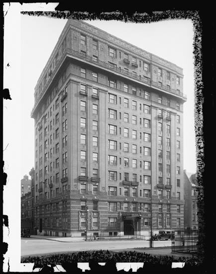 98th Street at the S.E. corner of West End Avenue. Apartment house.
