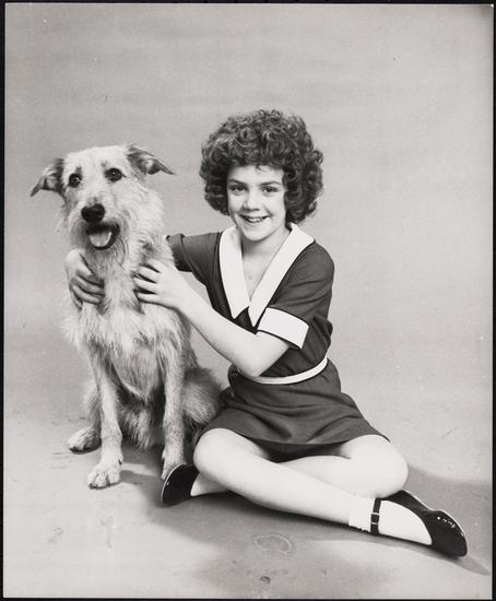 [Shelley Bruce as Annie with Sandy the dog in "Annie".]