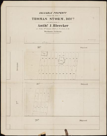 Map of Property in the 9th Ward in the City of New - York Belonging to the Estate of W. W. Gilbert, decd. to be sold at Auction by James Bleecker & Sons on the 21st January 1833.