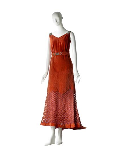 Evening dress in ivory satin with striped floral brocade and pink velvet