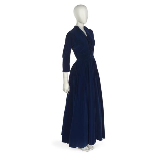 Hostess ensemble comprising ivory silk taffeta dress and black velvet cutaway coat