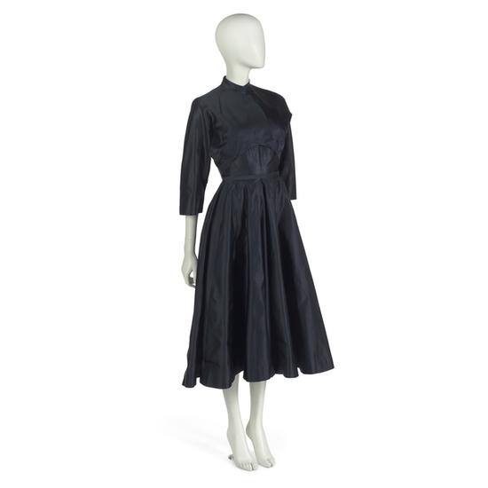 Hostess ensemble comprising ivory silk taffeta dress and black velvet cutaway coat