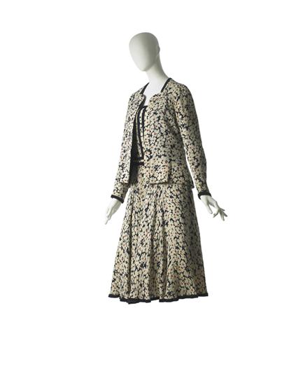 Day ensemble: Suit in black and white strié worsted with coordinating printed silk blouse
