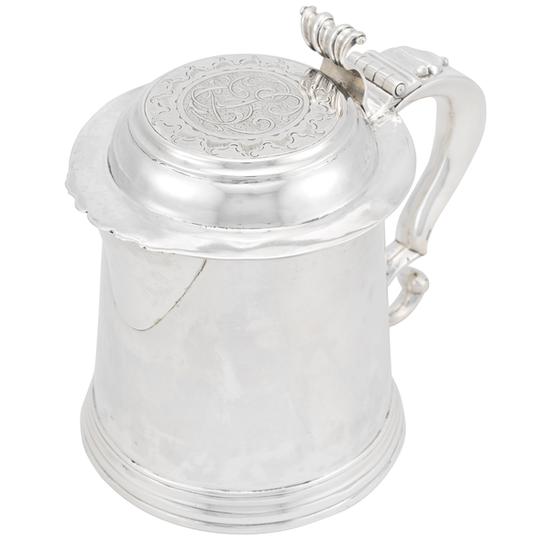 Tankard with straight sides tapering toward lip, applied molded baseband and applied molding at everted lip, S-scroll handle with pointed tip, double-stepped flat cover with cast scroll thumbpiece and crenate flange attached with five-part hinge with molded drop and engraved circular raffle around monogram on upper surface of cover (body cut away beneath spout added opposite handle). Inscription: Engraved within circular raffle on upper surface of cover: "EL" in interlaced foliate script and scratch weight "37 oz 5 dwt" engraved on underside of base. Mark: Struck on underside of base: "E-B" in rectangle, "E-BRASHER" in rectangle, "N-YORK" in rectangle.