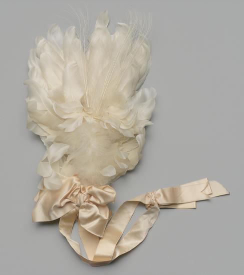 Folding feathered fan of shell pink ostrich and grey marabou feathers