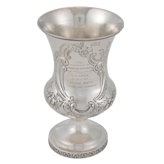 Goblet with tulip-shape body, an everted lip outlined with beading, and circular foot with a die-rolled border. Reserve repousséd with Rococo scrolls and floral motifs. Inscription: Engraved: "Awarded by the AMERICAN INSTITUTE/at the 23rd Annual Fair 1850/L. A. SAYRE/for the 2nd best/BLOOD MARE/'YOUNG LADY LIGHTFOOT'". Unmarked.