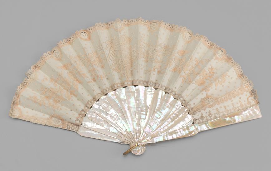 Folding fan of lace-overlaid satin leaf with painted central medallion