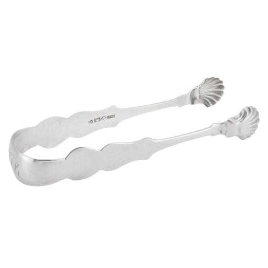 Sugar tongs with tapering bow-shaped handle and shell-shaped tips. Inscription: Engraved on handle: H. L. B. Mark: Marked on inside of one handle: B. G. / [man's profile] / [lion passant] / G.