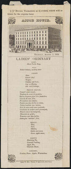 The Menu and Wine List of Wednesday, August 15, 1838 [Astor House] Is Reproduced Herein Through Courtesy of Hotel Waldorf Astoria