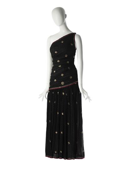 Dinner dress and jacket in black silk with beaded palm tree motif