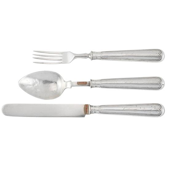 Fork with four tines and straight filled handle decorated with thread pattern. Inscription: Engraved on handle obverse: "Catharine". Mark: unmarked.