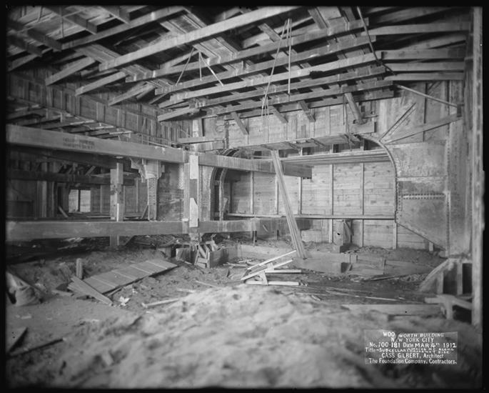 Woolworth Building, sub-cellar Park Place side, looking at shoring.