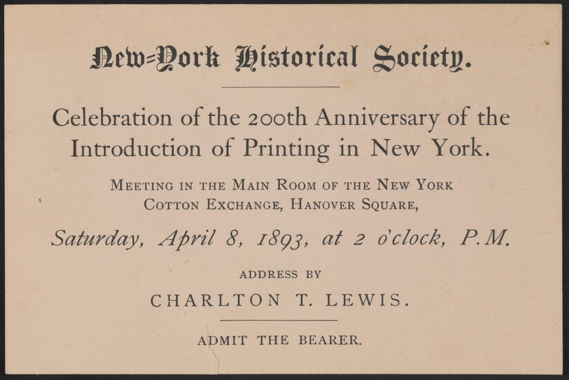 Resolution issued by the New-York Historical Society Library concerning the 200th anniversary of the introduction of the printing press, April 5, 1893