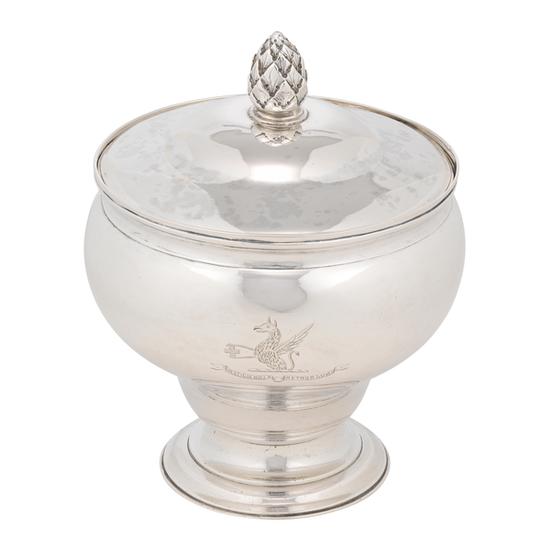 Raised circular inverted pyriform sugar bowl on lathe-turned stepped, domed, circular foot and applied molding at lip into which the circular slightly domed cover with pinecone finial fits. Inscription: Engraved on base: K / I+C. Engraved on body: [Kip family crest] / Jacobus Kip m. Catherine Kip / July 27 - 1729. Mark: On underside of base within conforming enclosure, in script: S T.
