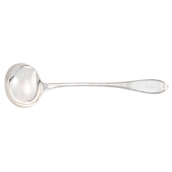 Ladle with oval bowl and handle with bead decoration and pointed tip in "Mayflower" pattern. Inscription: On handle in script: "M L T C". Mark: On reverse, incuse: "Wm GALE & SON"/"1852" in diamond/[circle]/"G&S" in oval.