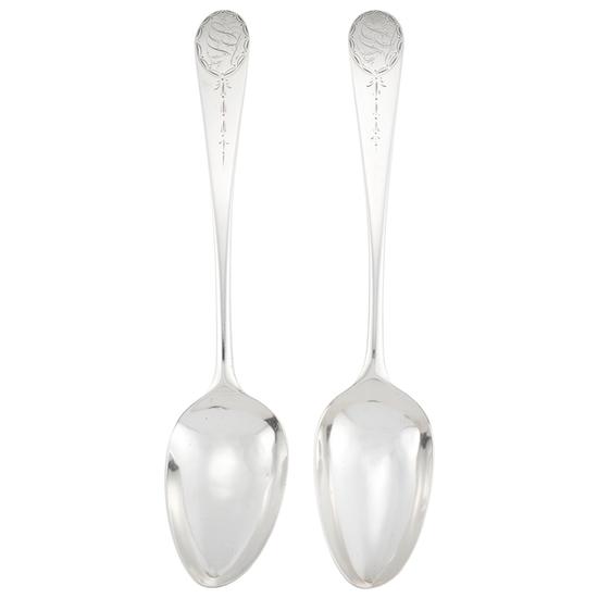 One of a pair of tablespoons with egg-shaped bowl, drop on bowl back, out-curved handles, and decorated with bright-cut medallion. Inscription: Engraved on handle obverse: L. E. L. | Mark: Marked on handle reverse: Burger.
