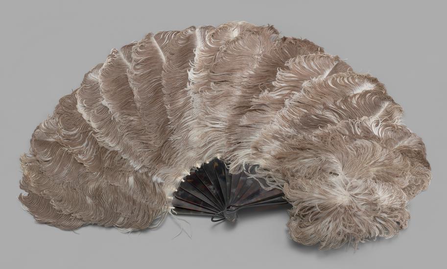 Folding feathered fan of shell pink ostrich and grey marabou feathers