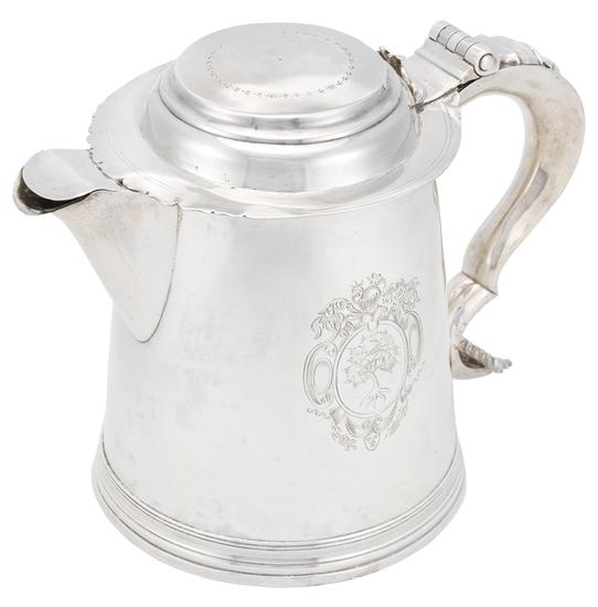 Tankard with plain tapering cylindrical body, molded band at the base, domed lid with crenate edge in front and engraved wreath on top, molded drop at top of the handle, and molded handle tip. The thumbpiece on the handle is missing and the spout was added at a later date. The body is engraved with the de Peyster coat-of-arms and Livingston coat-of-arms and crest. Inscription: Bottom of base engraved: "Robert Gilbert Livingston" ; "Helen Hake" ; "Frederic de Peyster" ; "Johnston Livingston de Peyster"; Engraved on the body: [de Peyster coat-of-arms and Livingston coat-of-arms and crest]/Motto "Spero Meliora".