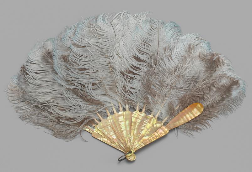 Folding feathered fan of shell pink ostrich and grey marabou feathers