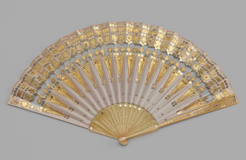 Folding fan of black Chantilly lace leaf with applied gold spangles