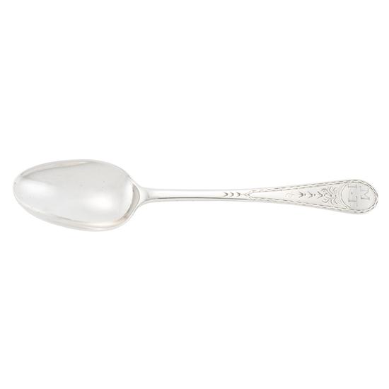 Teaspoon with oval bowl, double drop on back, and bright-cut decoration on handle with cartouche. Inscription: Engraved on handle obverse, within cartouche: M / I T. | Mark: Marked on handle reverse: SJ.