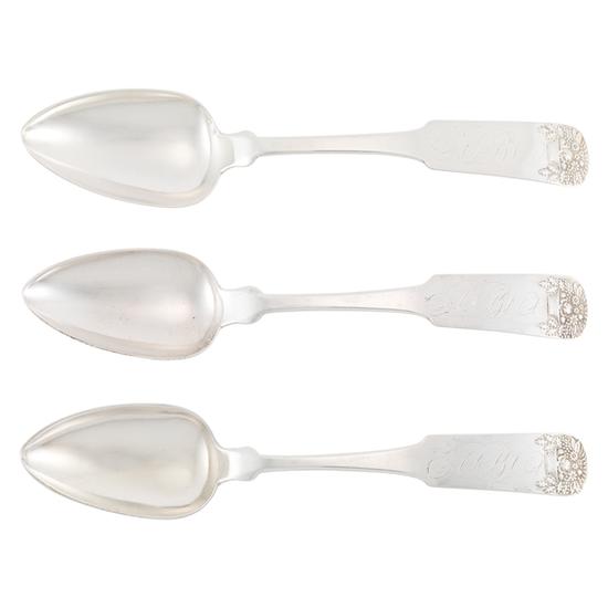 One of a set of three dessert spoons with pointed egg-shape bowl, downturned fiddle handle, and die-struck with flower basket motif. Inscription: Engraved on handle obverse: "ADBV" in script. Mark: On handle reverse: "BENEDICT & SCUDDER/NEW-YORK" in serrated rectangles.