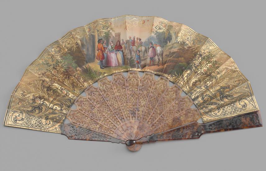 Folding fan of hand-painted stipple-engraved leaf