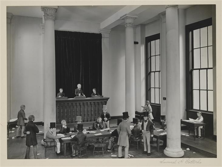 [Federal Hall, 1789, northeast corner of Wall and Nassau Streets. Photograph of the "Inauguration of Washington, 1789." Miniature group installed in the Altman Foundation Gallery at the Museum of the