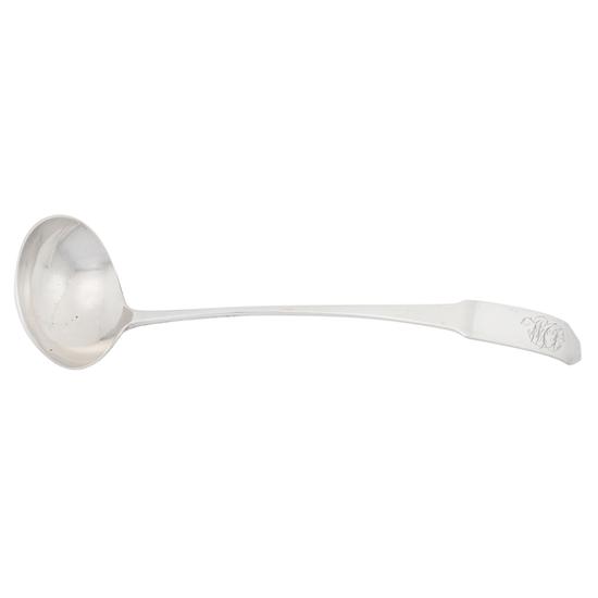 Ladle with oval bowl, rounded arched drop on the back, and downturned fiddle handle. Inscription: Engraved in feathered script on handle: "WCJ". Mark: On reverse: "RW" in oval.