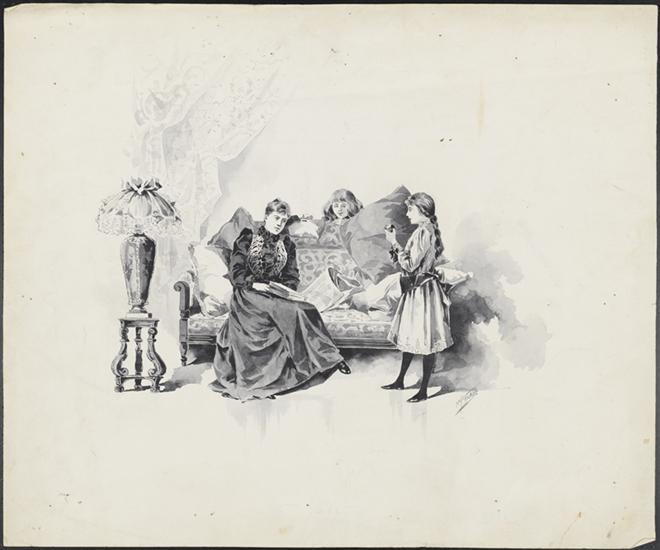 Alonzo and Marmaduke [Sketch of Two Seated Women Next to a Fireplace]