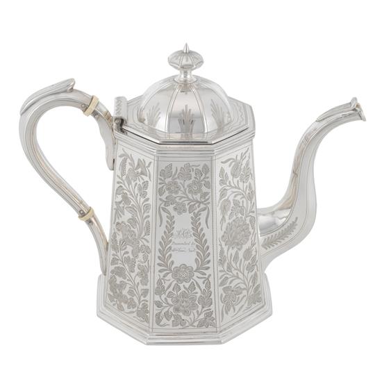 Teapot with seamed octagonal paneled body, domed octagonal cover terminating in faceted finial with central point, body, cover, and spout panels engraved with bright-cut floral motifs, reserve in central body panel, S-scroll paneled spout with interior strainer and modified C-scroll handle with ivory insulators. Inscription: Engraved in script within reserve on side of body: JAB / Presented by / Abm. Van Nest. Mark: Marked on base: E. STEBBINS & CO.