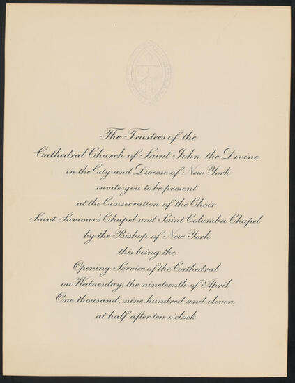 [Dedication, St. John's Cath., N.Y.]