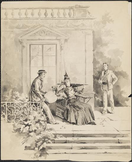 [Sketch of a Woman Standing Between Two Men in an Eastern Setting].